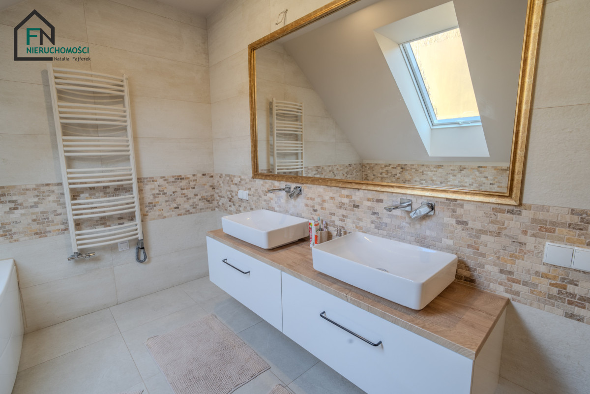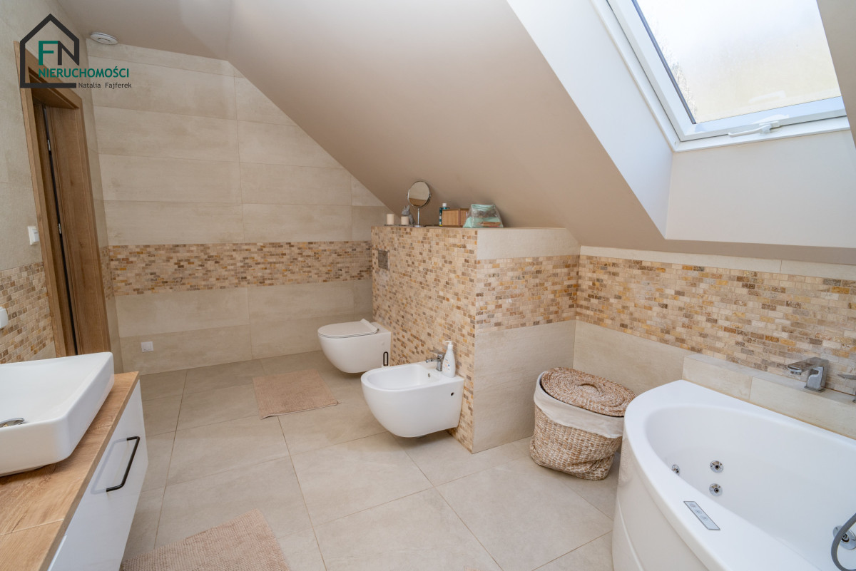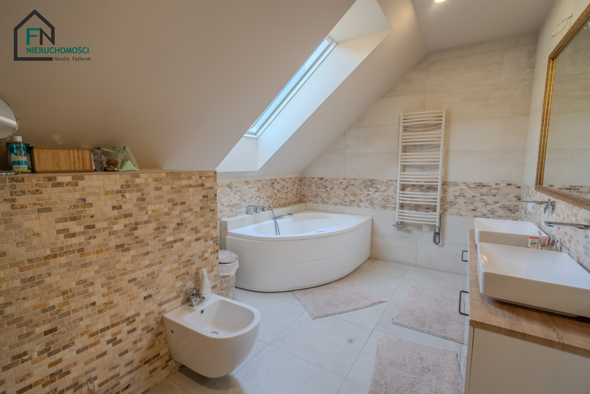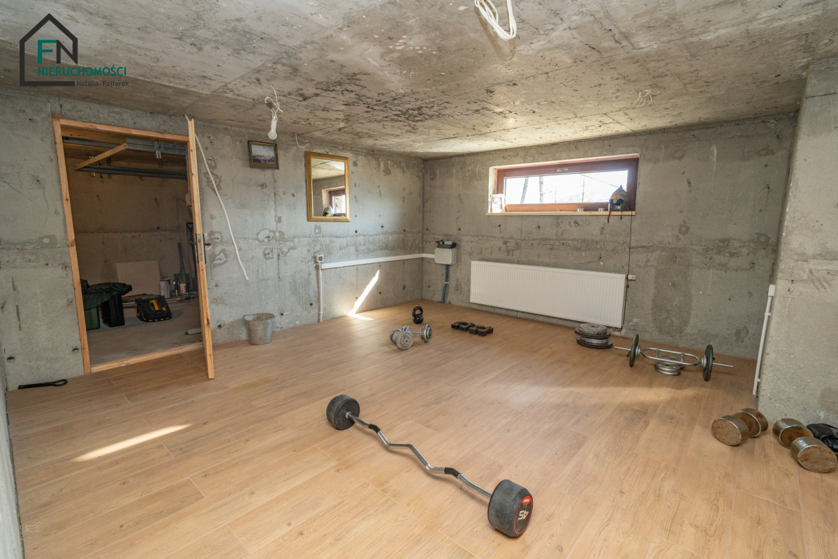 Dodatkowym atutem jest w pełni podpiwniczona część domu, oferująca m.in. przestrzeń fitness oraz pomieszczenie przygotowane pod prywatną strefę SPA z sauną.