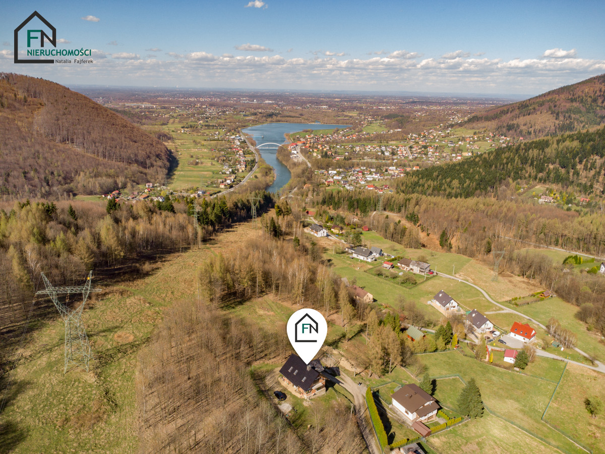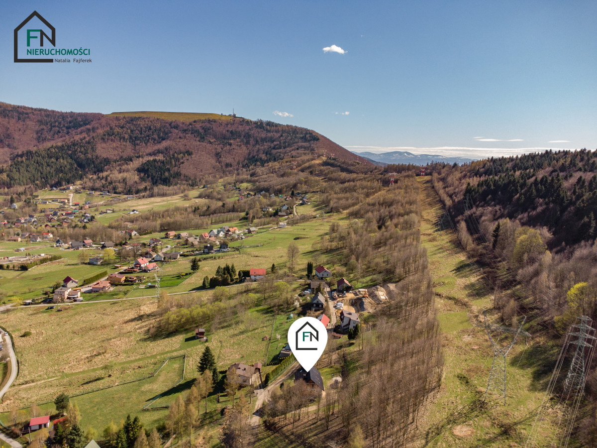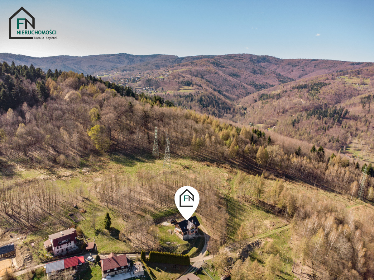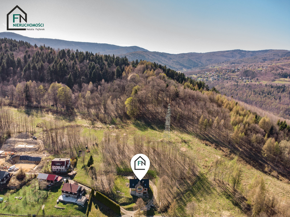 Nieruchomość położona jest zaledwie kilka minut od Góry Żar - jednego z najbardziej atrakcyjnych punktów rekreacyjnych regionu. Okolica zachwyca ciszą, zielenią i niepowtarzalnymi widokami, które można podziwiać bezpośrednio z wnętrza domu dzięki panoramicznym przeszkleniom.